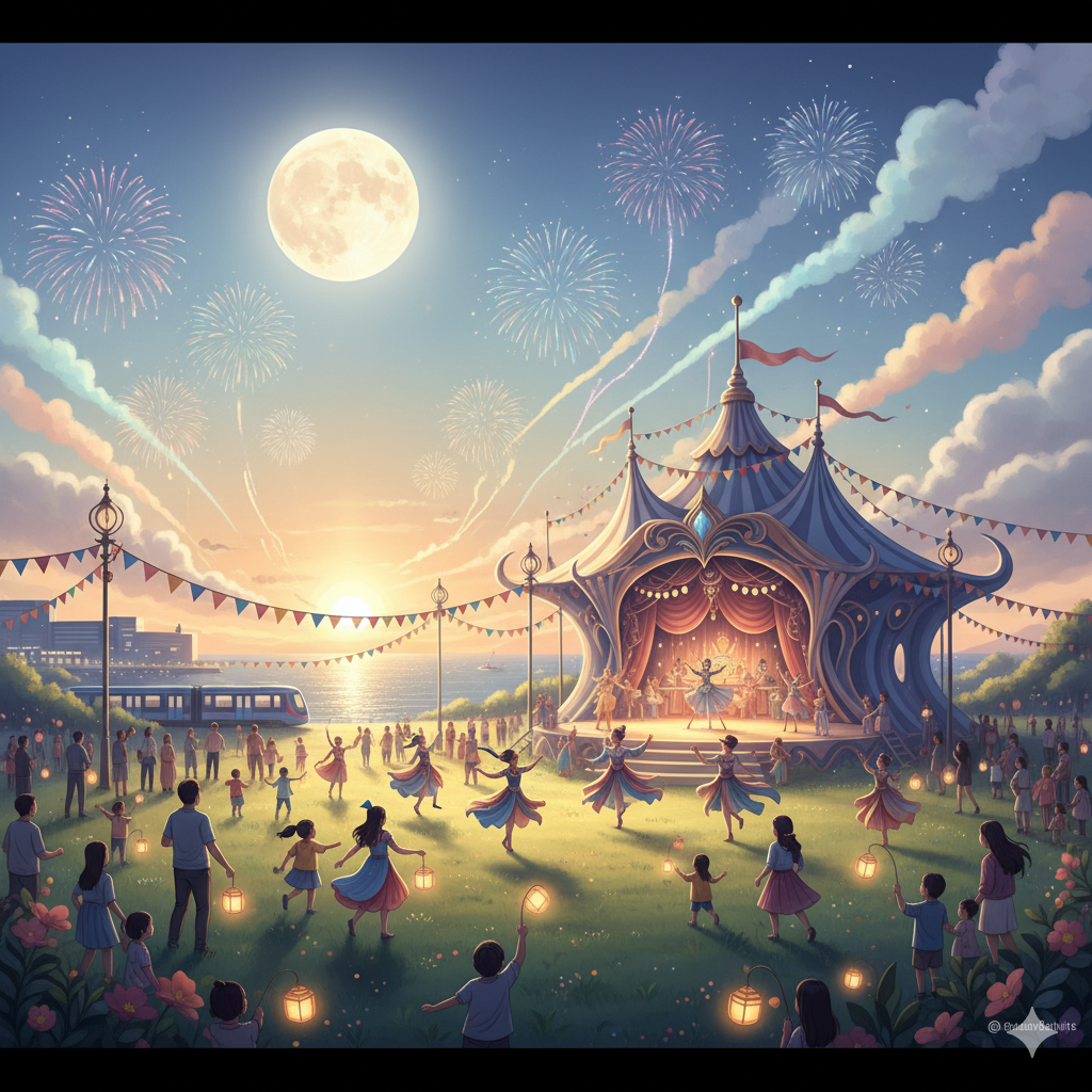 生成一張寬1080, 長1350像素的圖提示詞:高雄市高雄展覽館輕軌站旁大草地,夕陽映照海面,馬戲團帳篷華麗流線,月亮高掛,夜燈溫暖照亮草地與表演者, |