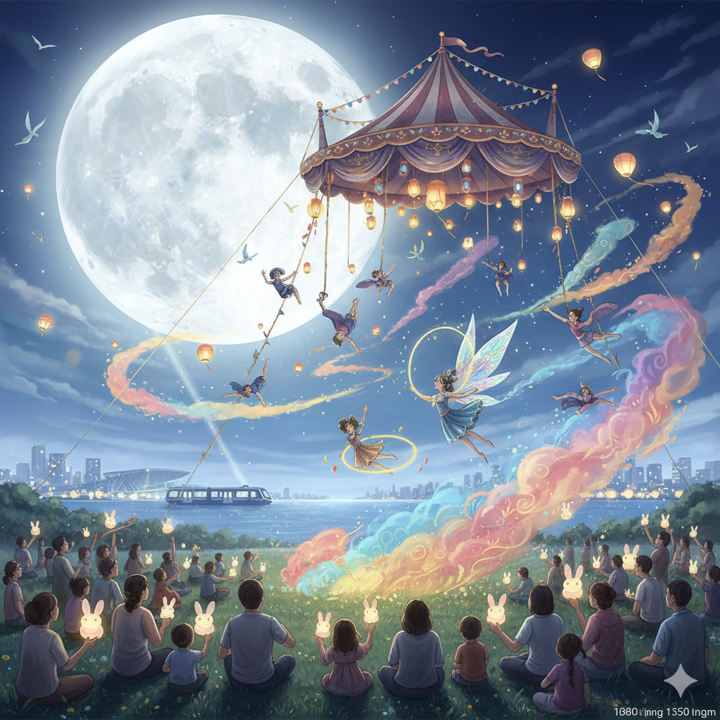 生成一張寬1080, 長1350像素的圖提示詞:高雄前鎮大草地,馬戲團帳篷漂浮在草地上,月亮明亮映照海面,空中表演者飛舞,彩色煙霧與光線交錯,觀眾層次分明, |