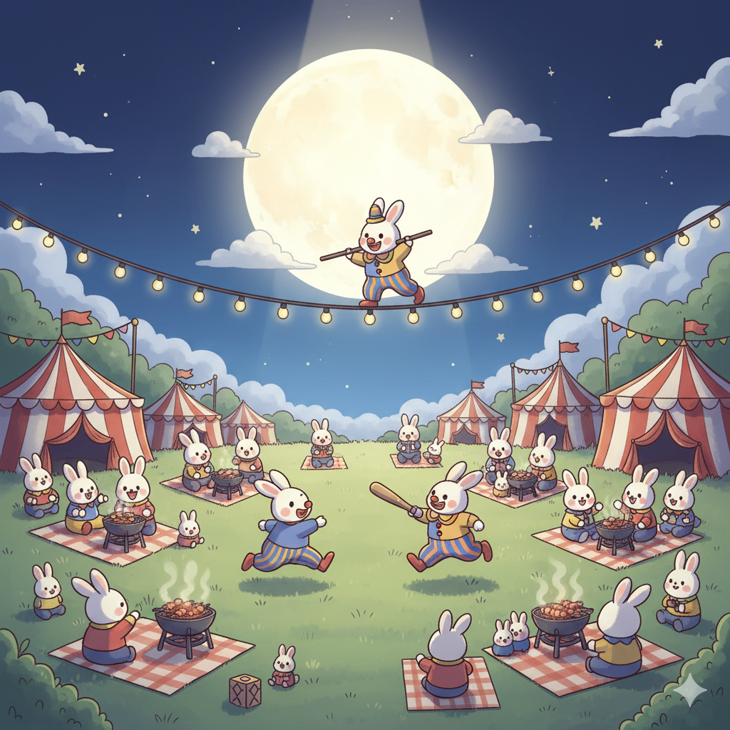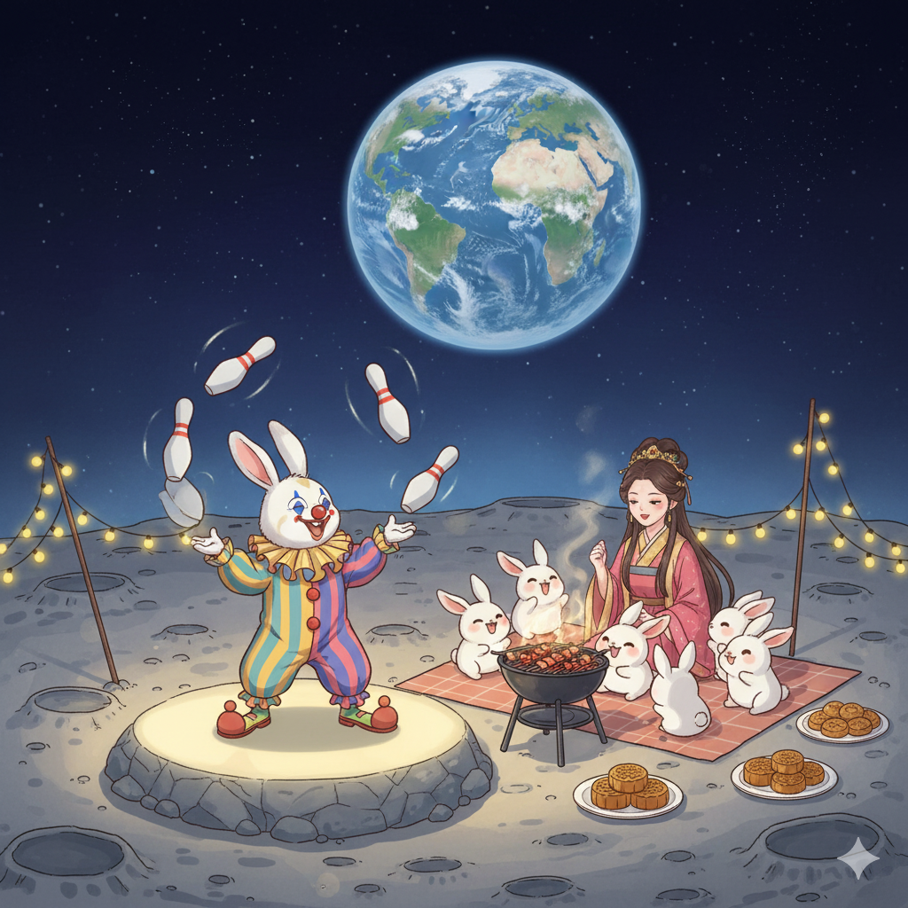 嫦娥跟小兔子家庭正在烤肉吃月餅並觀賞小丑兔子表演