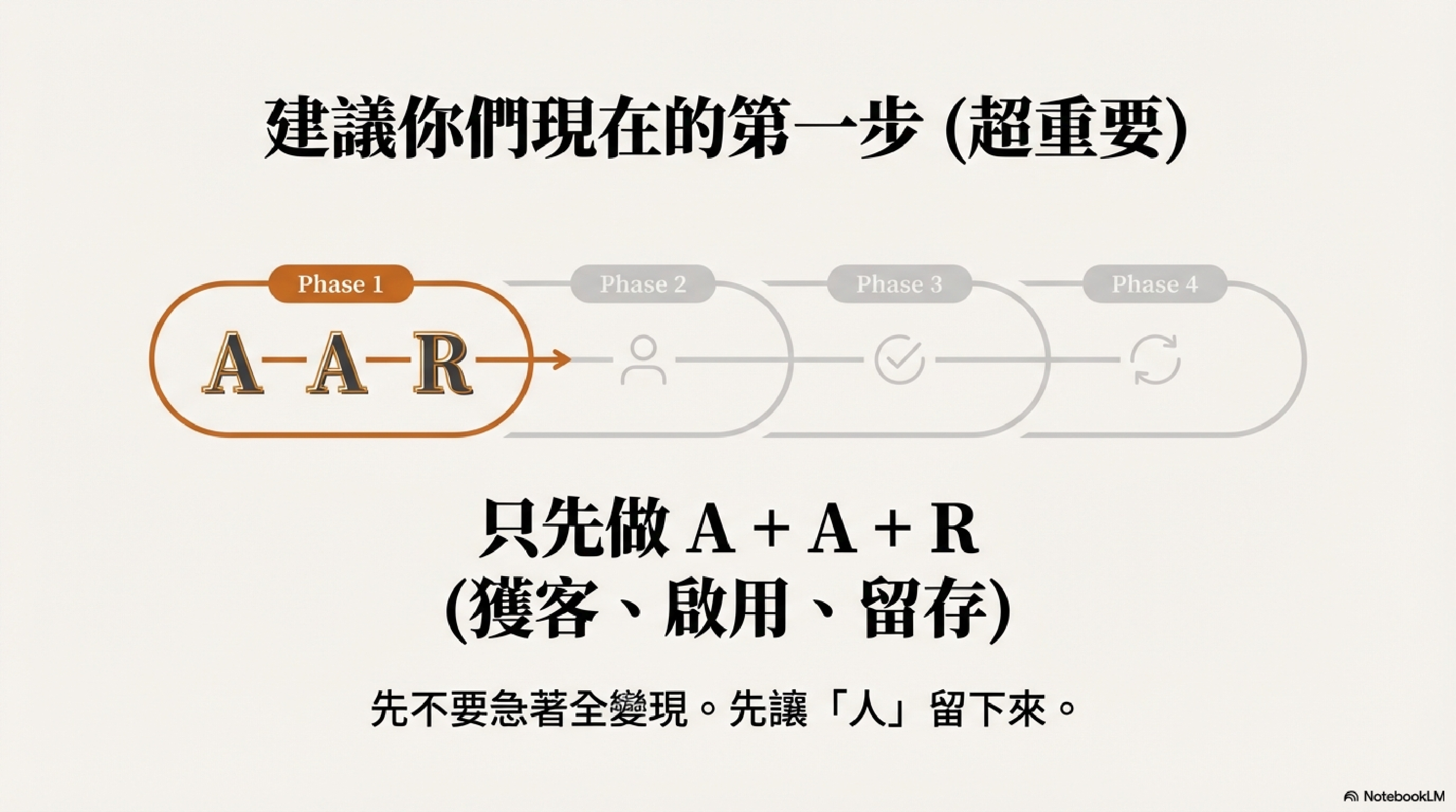 👉 只先做 A + A + R(獲客、啟用、留存)