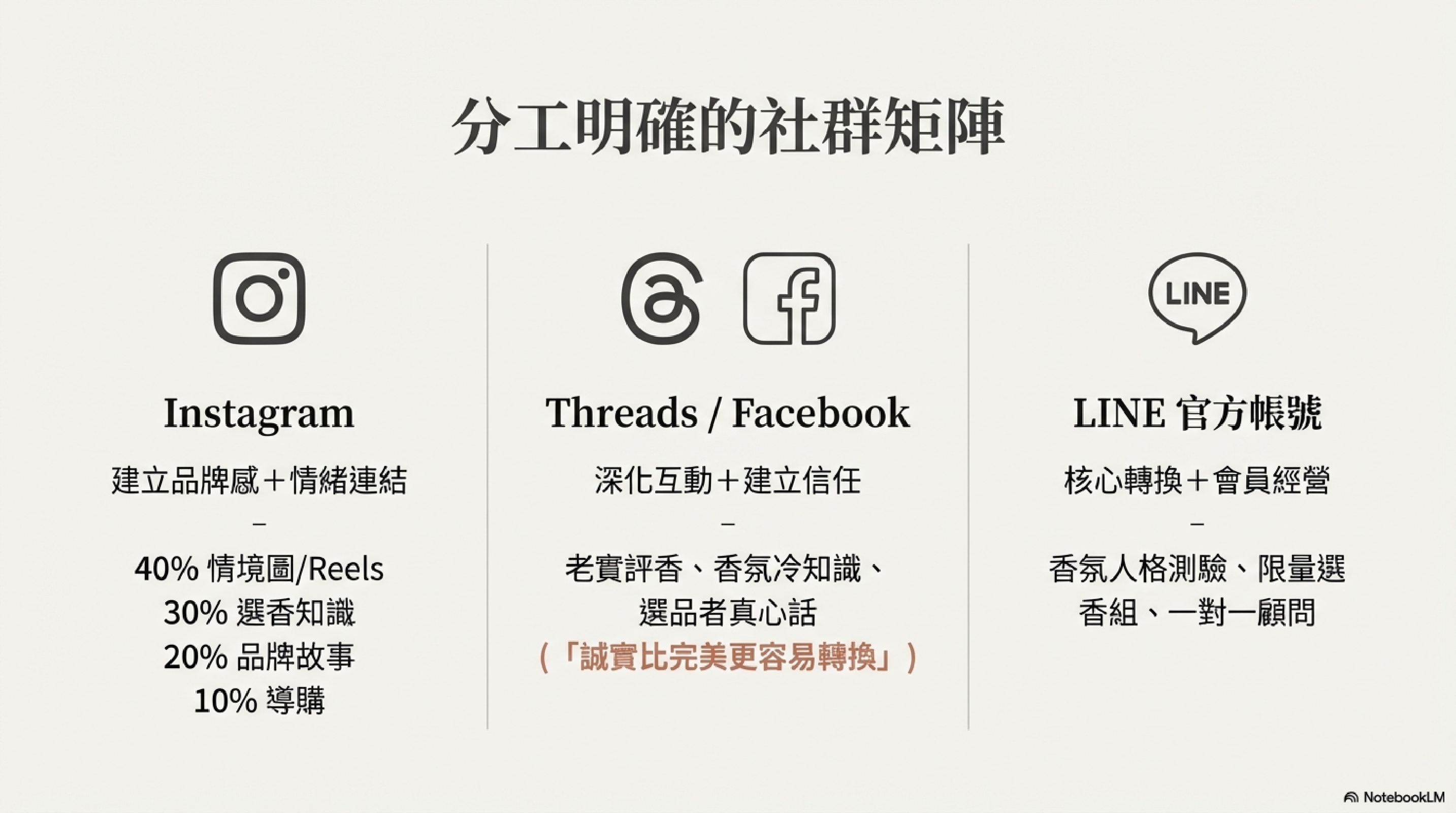 一、先釐清你的「角色定位」:你不是賣香味,而是「香氛策展人」在品牌與品牌之間競爭激烈的情況下,你不能只當通路商,你必須在社群裡扮演一個角色:「幫消費者選香、理解香、用對香的人」這會直接影響你社群內容的語氣與方向。建議定位三選一(或組合)香氛策展人:幫大家挑世界好香生活風格引導者:香氛 × 情緒 × 生活情境香氛顧問:新手也不會踩雷👉 一旦角色確立,社群就有「人格」,而不是品牌型錄。二、社群經營核心公式(非常重要)👉 社群不是賣產品,而是「建立信任 → 創造情境 → 引導轉換」你可以用這個 3 層架構來設計所有內容:✅信任層→為什麼要聽你的? →可提供社群內容:專業、策展、選香邏輯✅情境層→為..